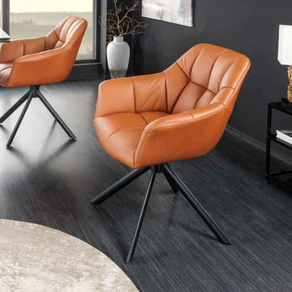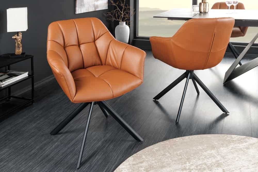 Dann wird Dich unser drehbare Stuhl LYON in hochwertigem cognac Echtleder mehr als nur begeistern! Dieser moderne Esszimmerstuhl ist mehr als nur ein Möbelstück – er ist Dein neuer Lieblingsplatz zum Verweilen.