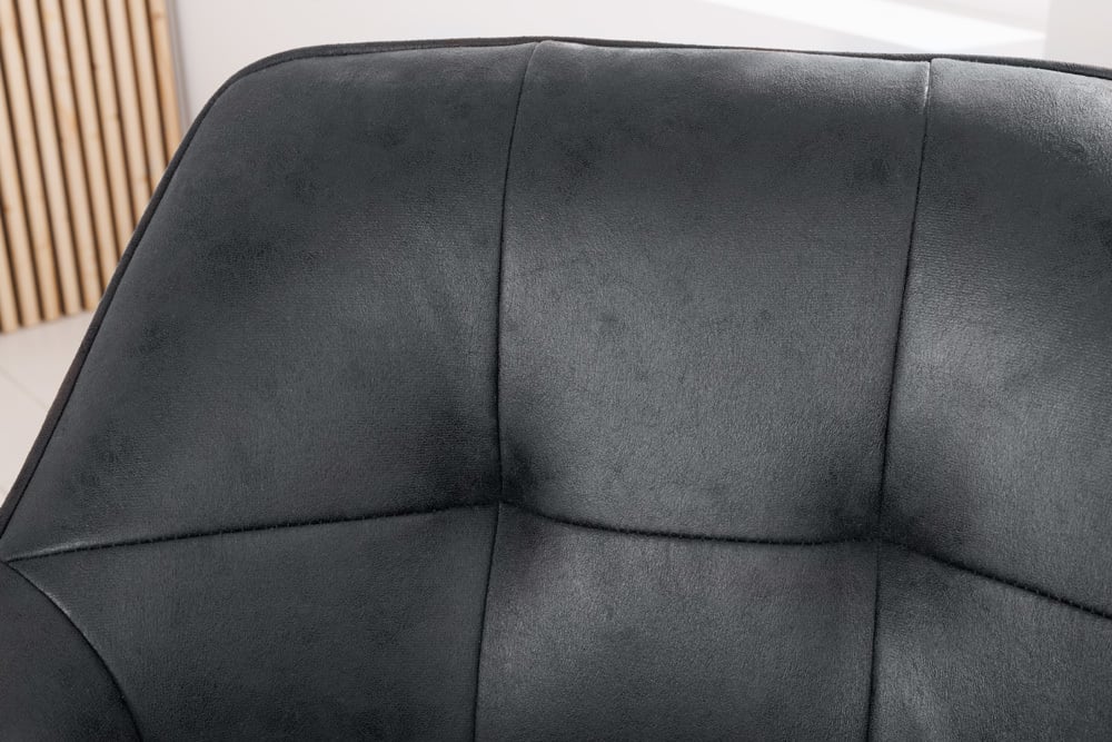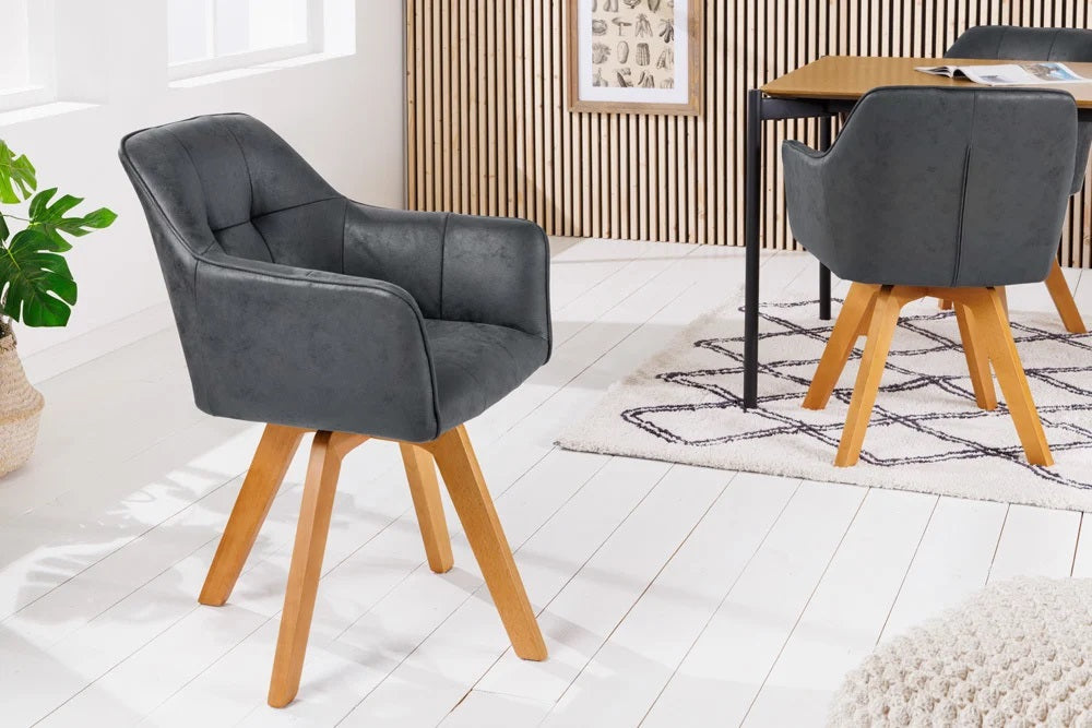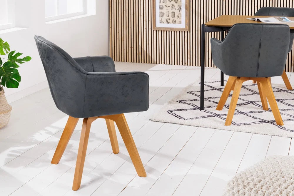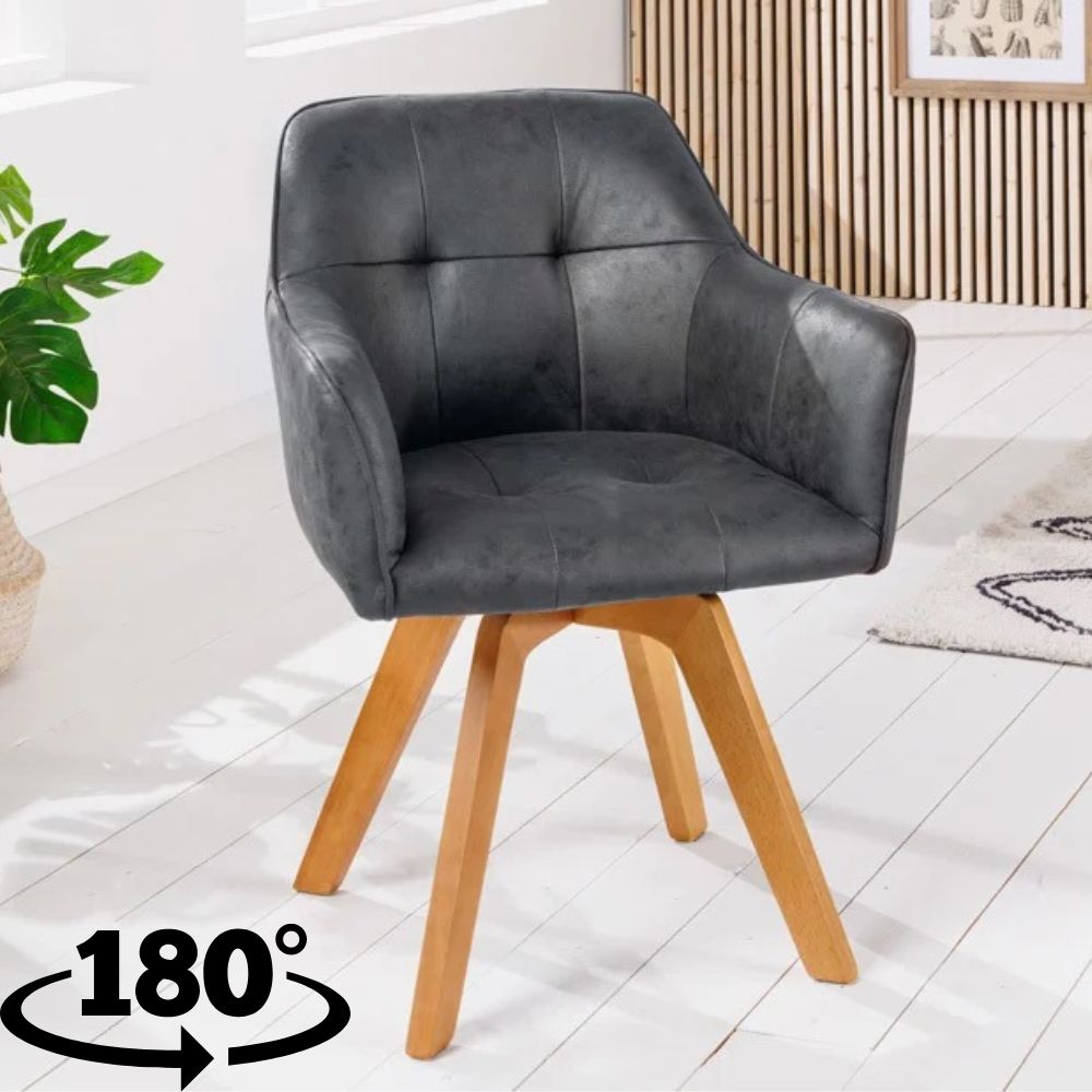 Ein Hauch von Exklusivität und Individualität kommt mit diesem Stuhl in dein Zuhause. Die Mischung aus elegantem Microfaserbezug und massiven Holzbeinen schafft ein wohnliches Ambiente . Durch die bequeme Polsterung und die komfortablen Armlehnen lädt dieser Stuhl zu einem langen Verweilen ein. Zusätzlich bietet sich die Möglichkeit die Sitzschale um 180° zu drehen, um danach aber auch immer wieder in die Ausgangsposition zurück zu kehren.