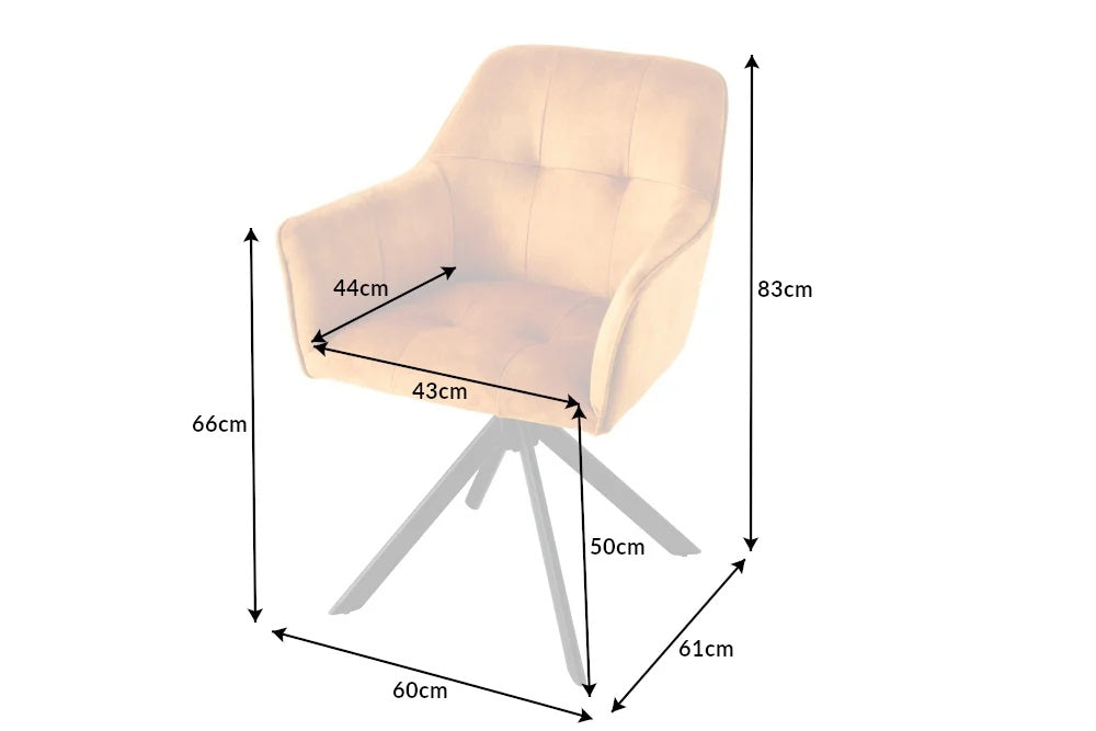 Ein Hauch von Exklusivität und Individualität kommt mit diesem Stuhl in dein Zuhause. Die Mischung aus hochwertigem Samtbezug (der Stoff ist auf min. 40.000 Scheuertouren getestet !) und modernen Metallbeinen wirkt sehr elegant. Durch die bequeme Polsterung und die komfortablen Armlehnen lädt dieser Stuhl zu einem langen Verweilen ein. Zusätzlich bietet sich die Möglichkeit die Sitzschale um 180° zu drehen, um danach aber auch immer wieder in die Ausgangsposition zurück zu kehren.
