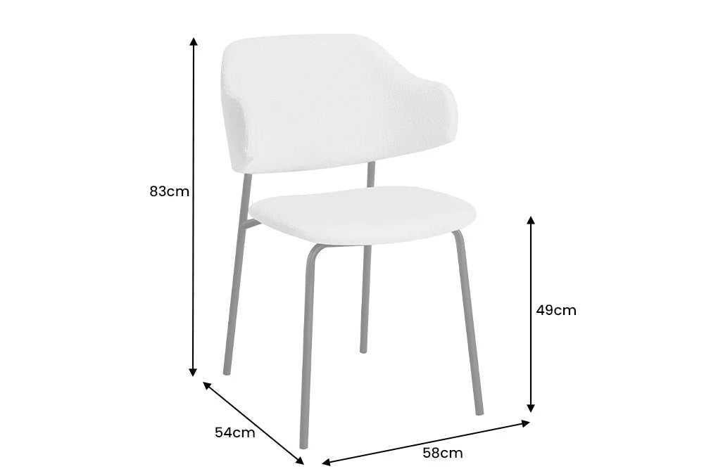 Der Designstuhl MODA ist ein eleganter und komfortabler Stuhl, der sich perfekt für Ihr Esszimmer oder Ihre Küche eignet. Der Stuhl ist aus hochwertigen Materialien gefertigt und hat ein zeitloses Design. Der Bouclé-Bezug ist in Weiss gehalten und verleiht dem Stuhl einen warmen und einladenden Look. Die schwarzen Metallbeine sorgen für einen stabilen Stand und einen modernen Touch.