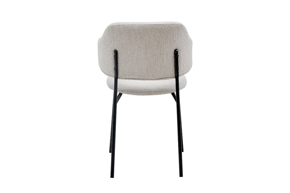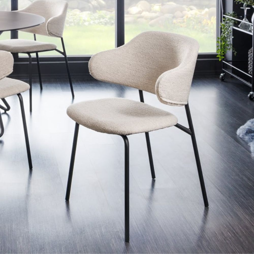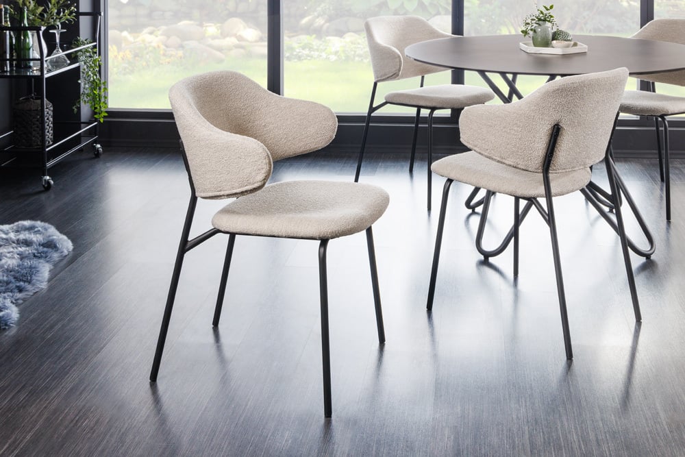 Der Designstuhl MODA ist ein eleganter und komfortabler Stuhl, der sich perfekt für Ihr Esszimmer oder Ihre Küche eignet. Der Stuhl ist aus hochwertigen Materialien gefertigt und hat ein zeitloses Design. Der Bouclé-Bezug ist in Grau-Greige gehalten und verleiht dem Stuhl einen warmen und einladenden Look. Die schwarzen Metallbeine sorgen für einen stabilen Stand und einen modernen Touch.