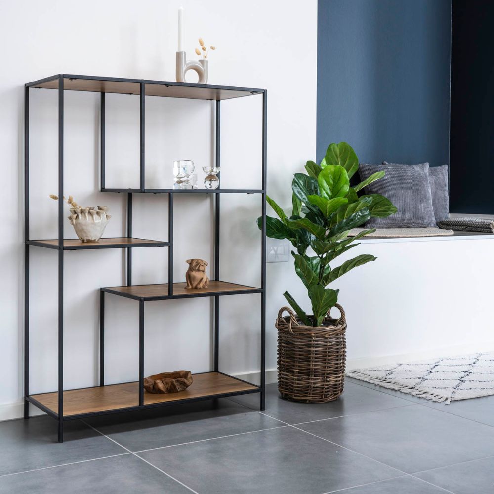 Dieses stylische Standregal ist die perfekte Kombination aus angesagtem Design und praktischer Funktionalität. Die Regalböden bestehen aus hochwertigem Holzwerkstoff in einer edlen Eiche-Optik. Zusammen mit dem stabilen, schwarzen Metallgestell entsteht so das unverwechselbare Industrial Design des geräumigen Regals.