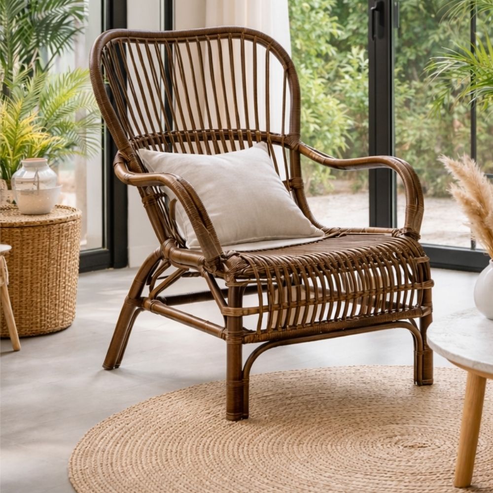 Das naturbelassene Rattan verleiht dem Sessel seinen authentischen Charakter. Die lebendige Flechtstruktur macht jedes Stück zu einem Unikat und harmoniert ideal mit modernen Wohnkonzepten, natürlichen Materialien und hellen Farben. Gleichzeitig ist der Sessel stabil, langlebig und angenehm leicht – so lässt er sich flexibel im Raum platzieren.
