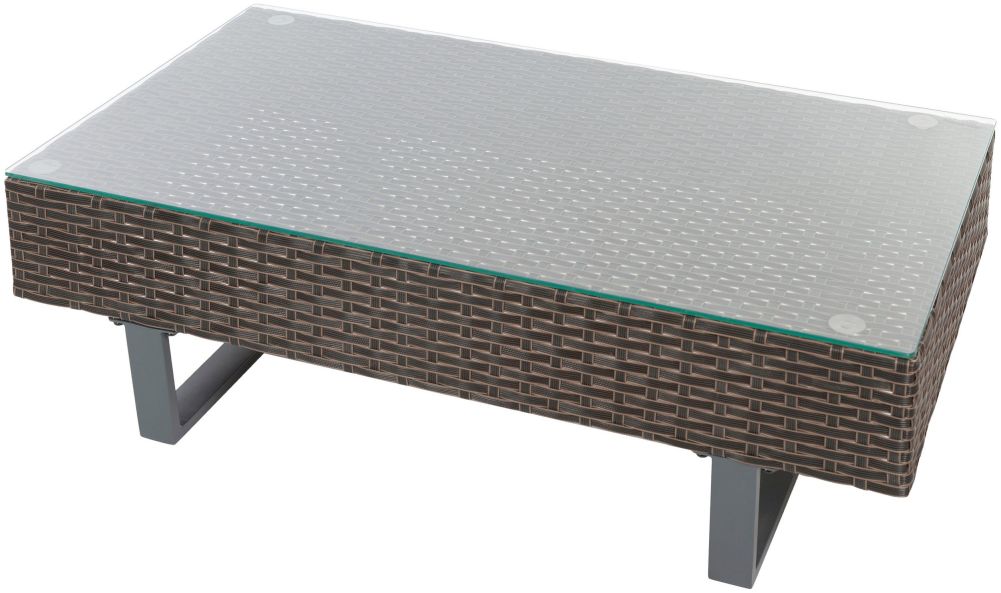 - Materialien: Polyrattan-Geflecht / Stahlgestell / Glasplatte