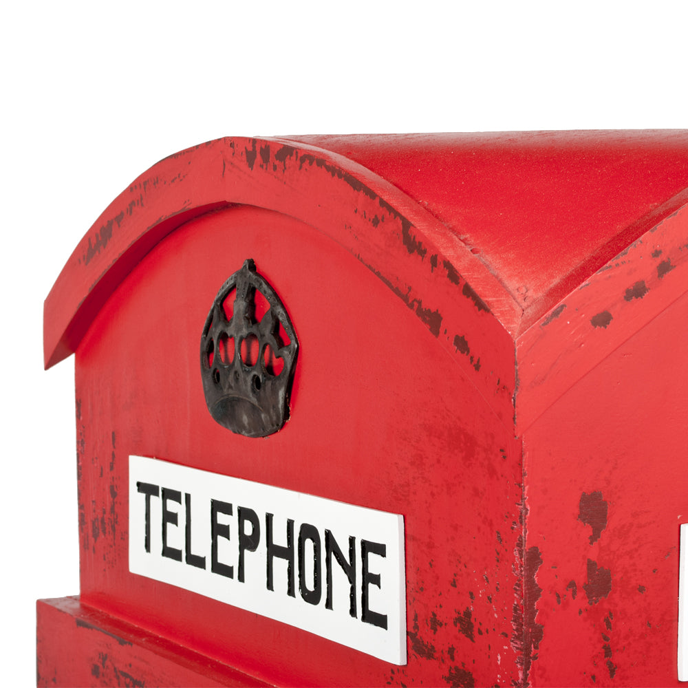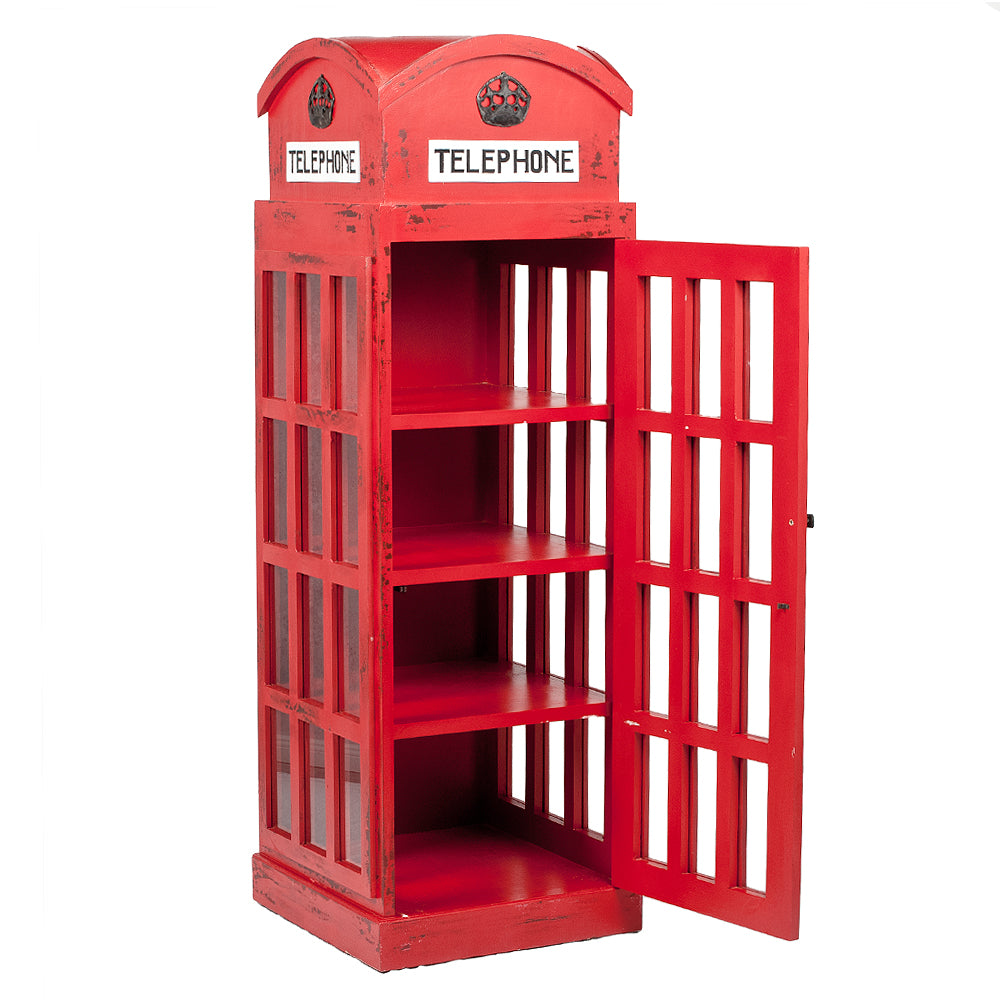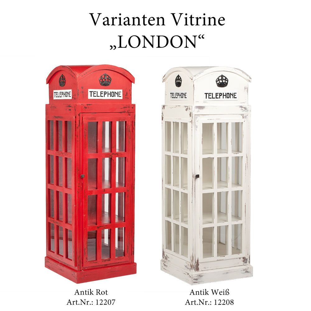 Eine Vitrine, die das Design einer typischen Londoner Telefonzelle imitiert – sehr britisch.