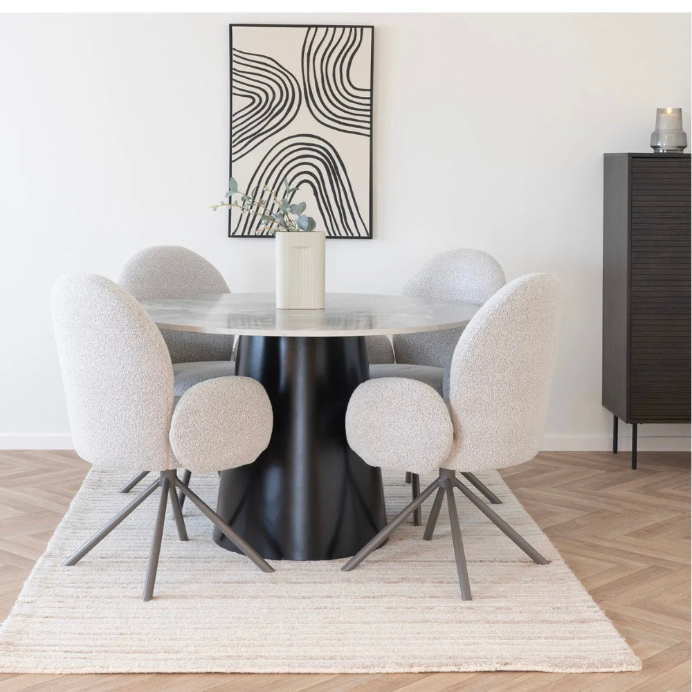 Der SOPHIE ist nicht einfach ein Stuhl – er ist ein Statement. Mit seinem luxuriösen Bouclé-Teddystoff in zartem Sand lädt er ein, Platz zu nehmen und bewusst den Moment zu genießen. Die cremig weiche Textur und zurückhaltende Farbnuance kreieren eine Atmosphäre, die Wärme und Stil vereint.