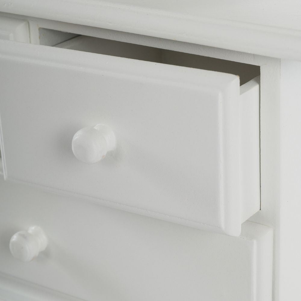 Dann ist die kleine Kommode NANDO genau das Richtige für dich! Diese wunderschöne Kommode ist aus Vollholz und MDF gefertigt und in einem klassischen Weiß mit antikem Finish lackiert. Die Kommode NANDO verfügt über drei Schubladen, in denen du Schmuck, Haaraccessoires und andere Kleinigkeiten verstauen kannst. Außerdem hat sie einen schönen Spiegel, der dir beim Schminken oder letzten "Kontrollblick" hilft. Der Spiegel ist mit einem dekorativen Rahmen versehen, der das Design der Kommode perfekt ergänzt.
