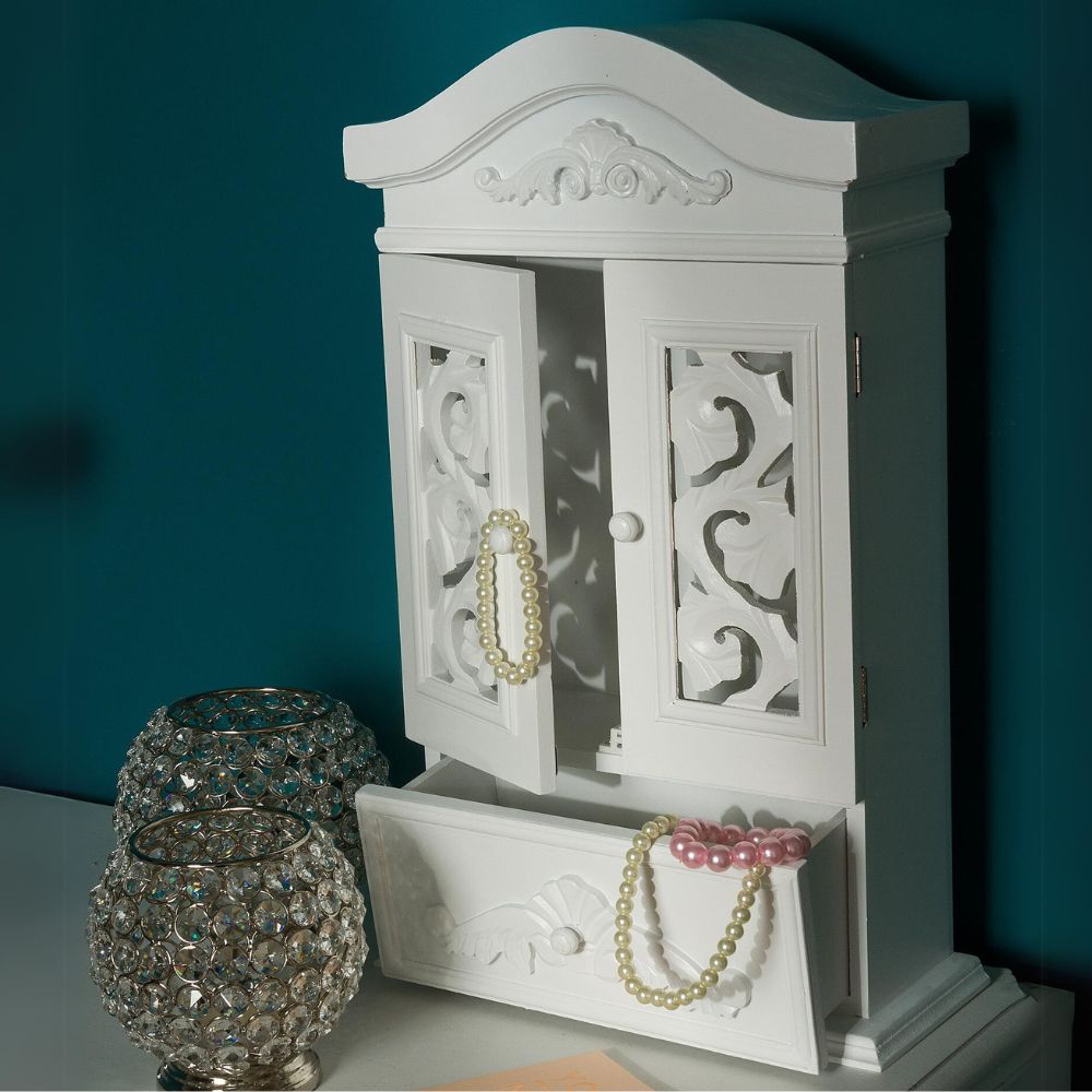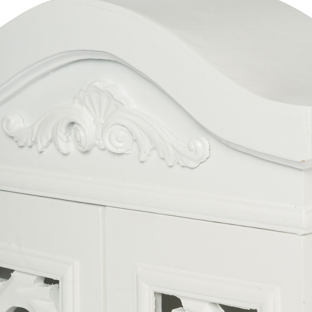 Der Schlüsselschrank NADJA ist ein elegantes und funktionales Accessoire, das Deinem Zuhause einen Hauch von Romantik verleiht. Der Schlüsselkasten ist aus MDF und Massivholz gefertigt und besticht durch seine feine Verarbeitung und das romantische Design. NADJA hat eine Schublade und 2 Türen, so dass Du viele Kleinigkeiten stilvoll aufbewahren kannst. Das kleine Schränckchen ist ein tolles Accessoire für Deinen Flur, Dein Schlafzimmer oder Orte an denen Du sonst noch Kleinigkeiten verstauen möchtest. Er ist auch ein schönes Geschenk für Ihre Freunde oder Familie.