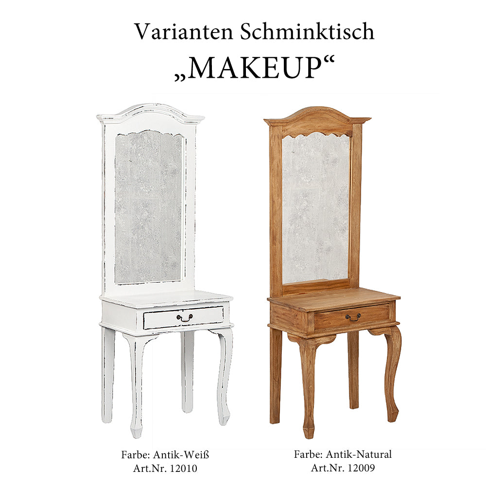 Der Schminktisch MAKEUP gehört zudem zu unserem großen Sortiment im Vintage-Style bzw. Shabby Chic-Look. Leicht verspielt und den Hauch an Romantik bietet dieser Artikel ganz gleich in welchem Wohnbereich er genutzt wird. Als nützlich erweist sich zudem die Schublade zum Verstauen diverser Kleinteile und Utensilien. Der lange, hohe Spiegel bietet besondern viel Platz zum Fertigmachen. Den besonderen Charme erhalten diese Artikel durch die kleinen Unregelmäßigkeiten im Holz und in der Lackierung. Optimale Einsatzmöglichkeiten im Schlafzimmer, Kinderzimmer oder einer anderen Räumlichkeit.