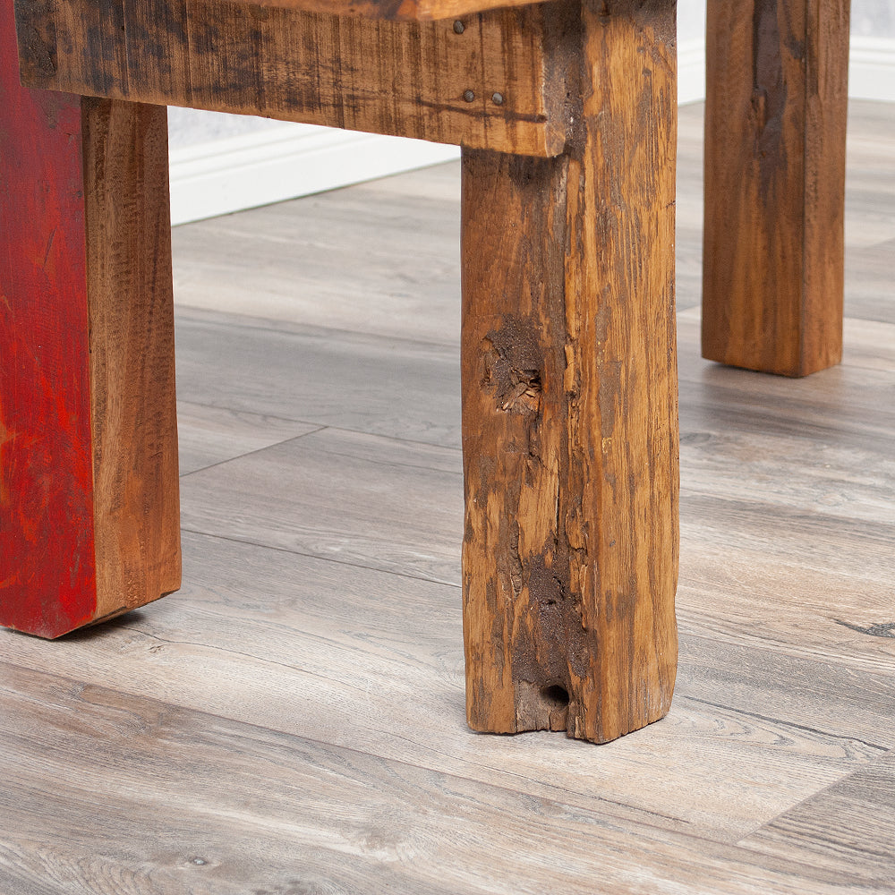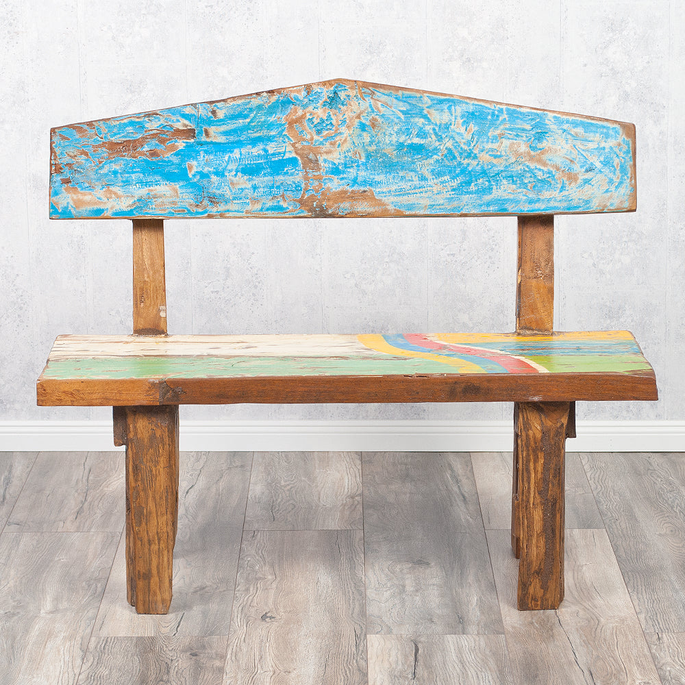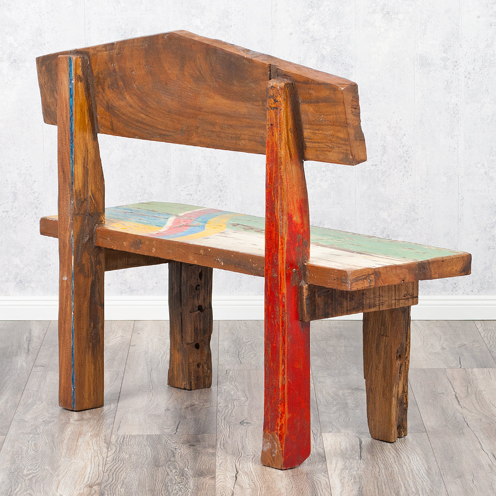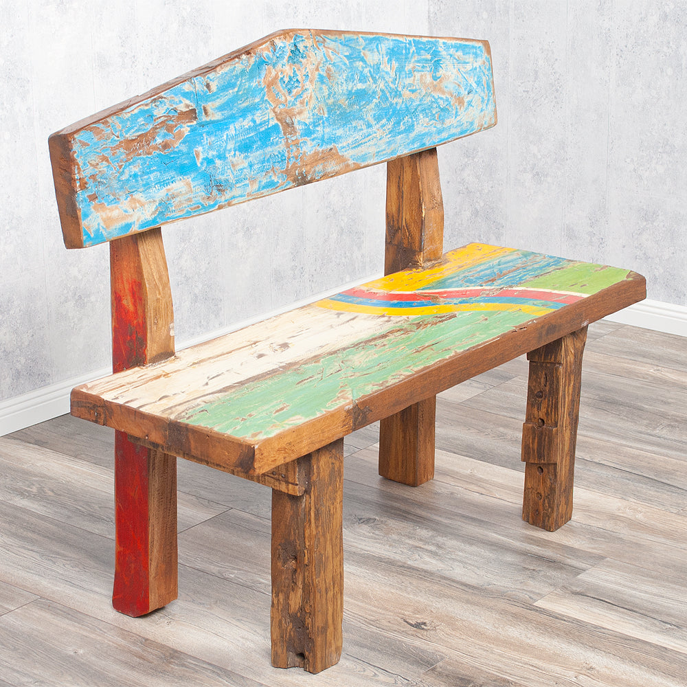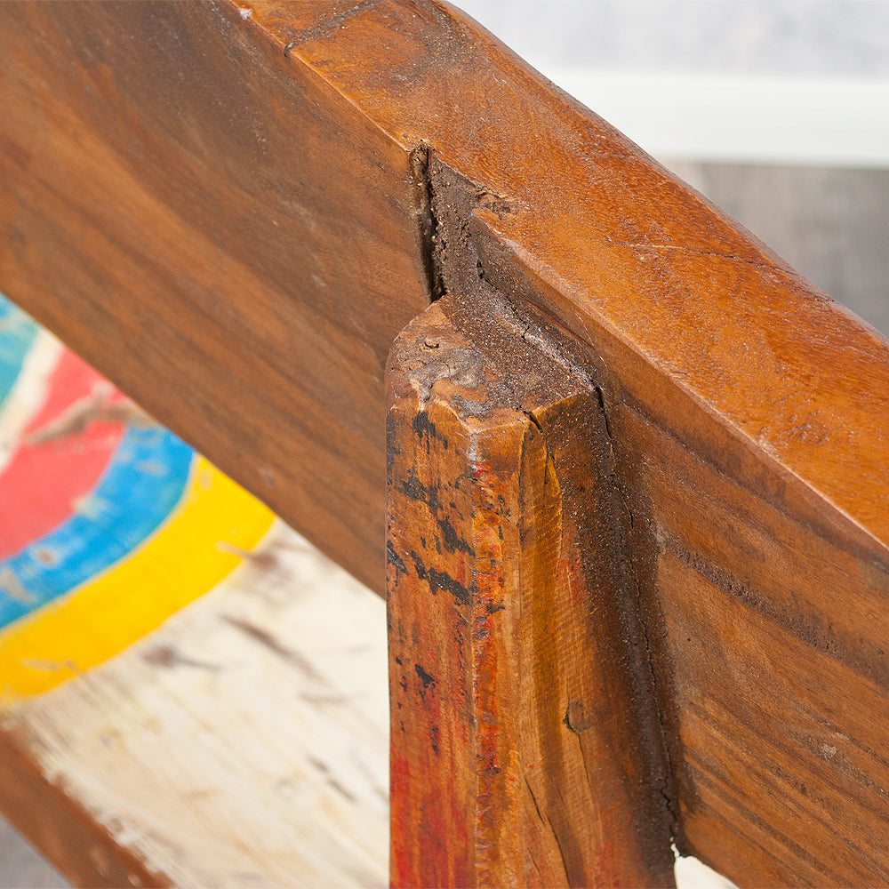 Diese Sitzbank WICKIE ist aus recyceltem Holz gearbeitet und immer ein Unikat. Die massive Bauweise und die individuell auftretenden bunten Farben unterstreichen den rustikalen Look dieser einzigartigen Sitzgelegenheit.