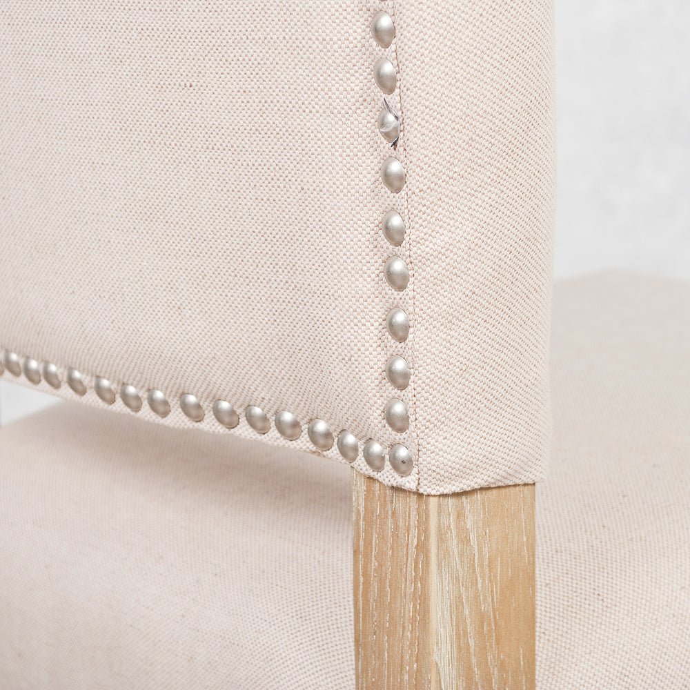 - Material: Stoff (Bezug), Rubberwood-Holz (Gestell/Beine), Deko-Nieten