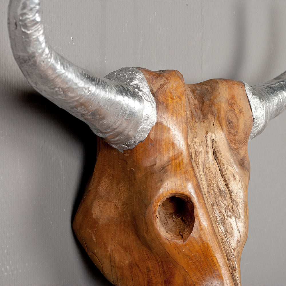 Der dekorative Tierschädel CABRA aus Teak und Aluminium ist das perfekte Wohnraum-Accessoire. Eine Wandhalterung (Öse) ist an der Rückseite angebracht.