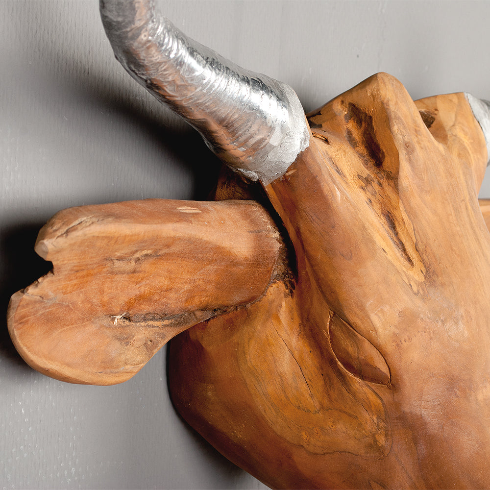 Der dekorative Tierschädel TAURO aus Teak und Aluminium ist das perfekte Wohnraum-Accessoire. Eine Wandhalterung (Öse) ist an der Rückseite angebracht.