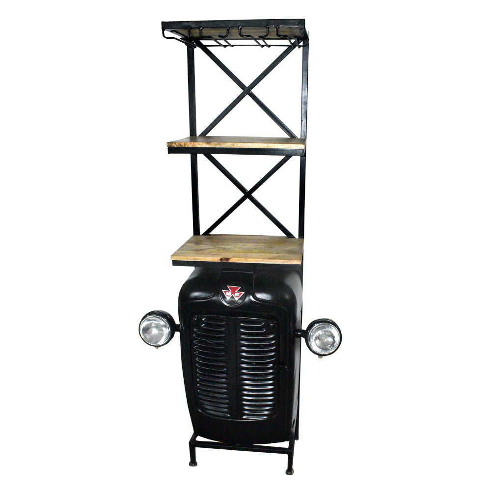 Traktor-Bar-Regal INDUSTRY im Vintage-Style. Ein echtes Retro-Design-Highlight in der Optik einer Traktor-Front für Ihren Wohnbereich, ganz gleich ob im Wohnzimmer, der Küche, im Esszimmer oder in einer anderen Räumlichkeit. Hinter der, mit einem Riegel schließbaren Tür, befindet sich die Möglichkeit der Lagerung von bis zu neun Weinflaschen (max Länge Weinflasche. ca. 34cm). Zudem sorgen vier Weinglasschienen für die stilvolle Aufbewahrung ihrer Gläser. Pro Schiene, je nach Glasform, ca. 3-4 Gläser. Die beiden Ablagefächer bieten viel Platz für Utentilien und Dekoration. Bei diesen Artikeln handelt es sich um alte, gebrauchte, ehemals im Strassenverkehr genutzte Fahrzeuge / Fahrzeugteile, welche nun zu einzigartigen Möbelstücken verarbeitet wurden. Gebrauchsspuren, Kratzer, Beulen oder ähnliches sind somit gewollt und verleihen dem Artikel seinen unverkennbaren, charakteristischen Used-Look. Die Farbgestaltung ist bei jedem dieser Artikel unterschiedlich.