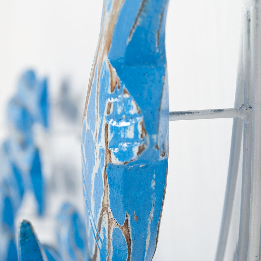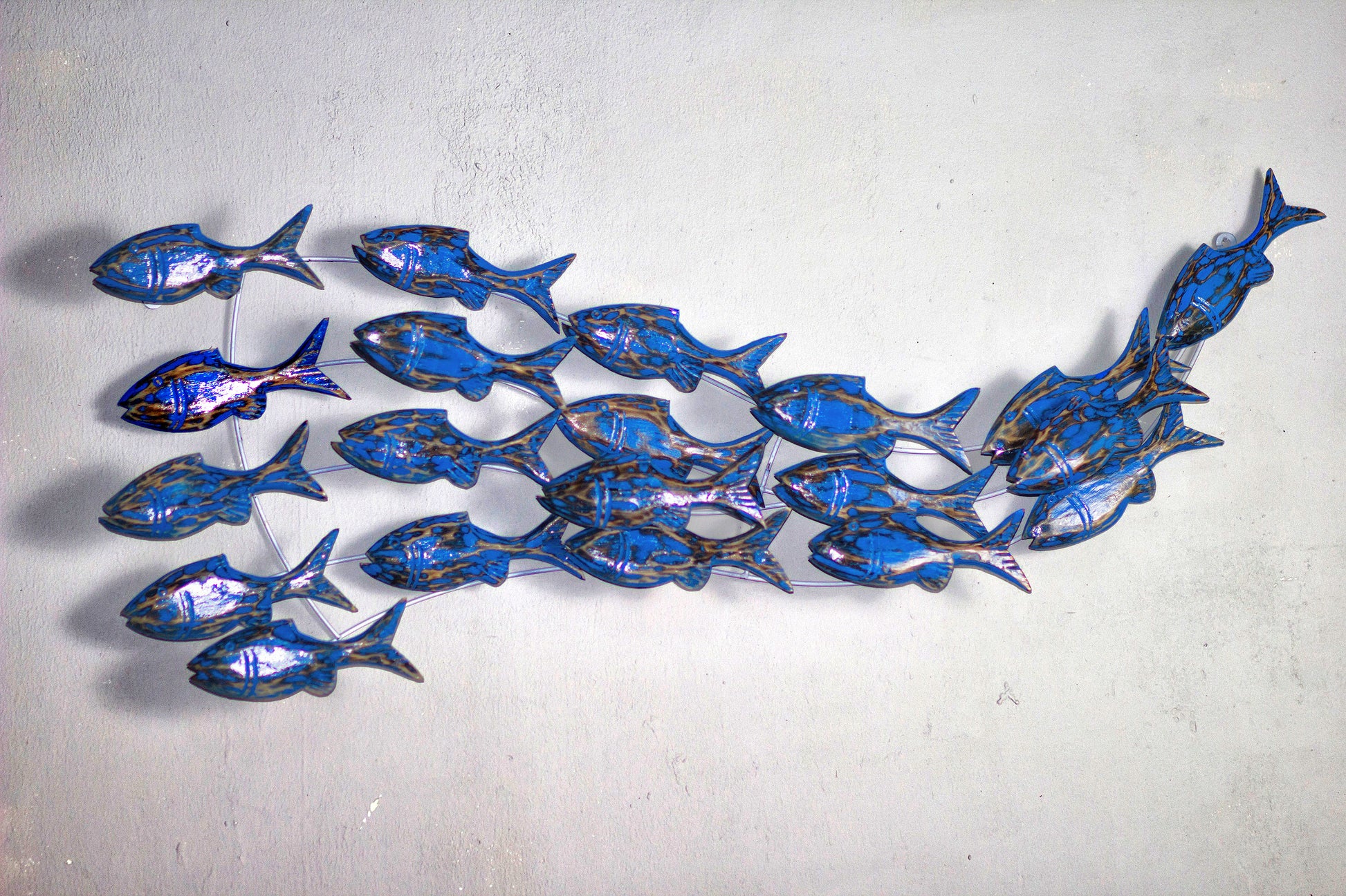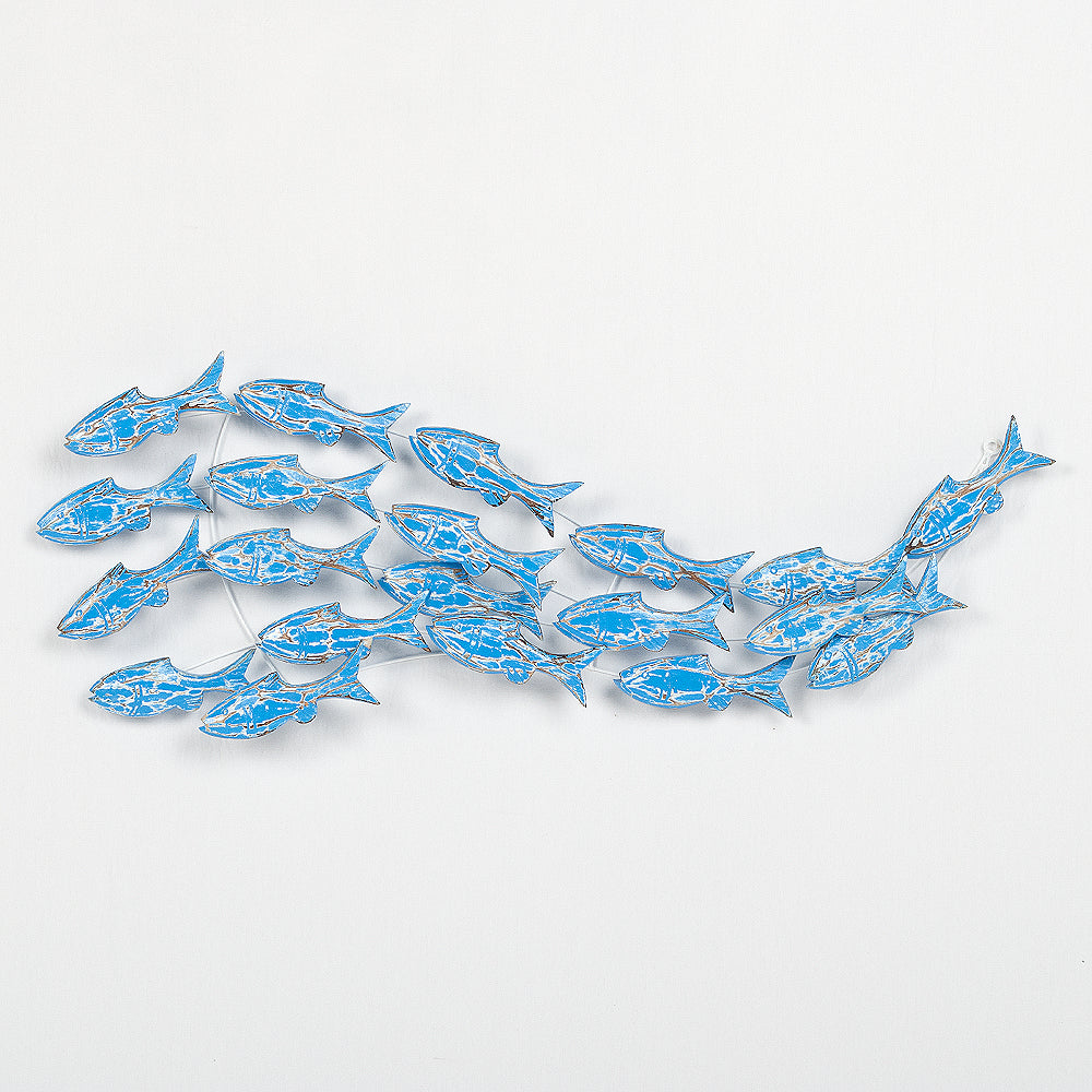 Wand-Deko IKAN aus Albasia Holz - Blue Wash. Außergewöhnliche Wanddekoration in Form eines Fischschwarmes. Die Fisch-Figuren bestehen aus Holz und sind auf einem Metallgestell befestigt, welches sich problemlos an der Wand befestigen lässt (Ösen).