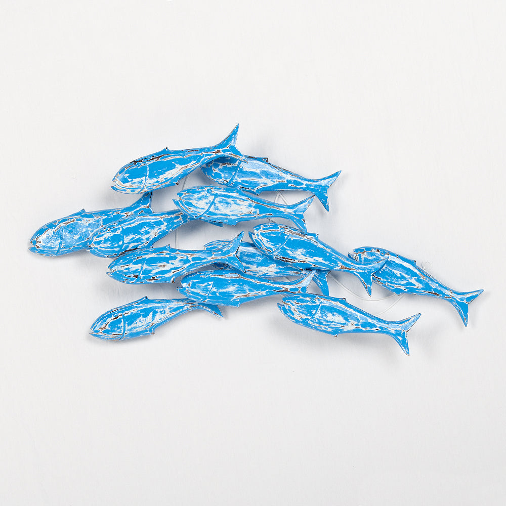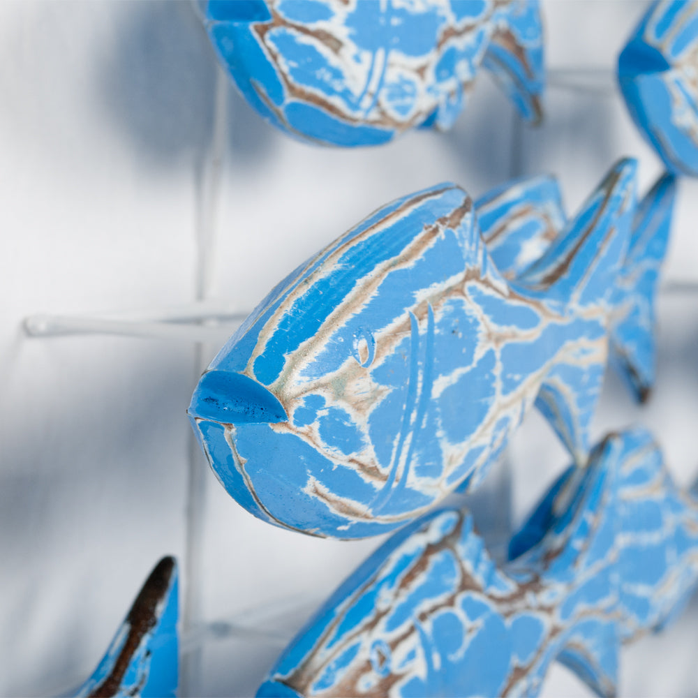 Wand-Deko IKAN aus Holz - Blue Wash. Außergewöhnliche Wanddekoration in Form eines Fischschwarmes. Die Fisch-Figuren bestehen aus Holz und sind auf einem Metallgestell befestigt, welches sich problemlos an der Wand befestigen lässt (Ösen).