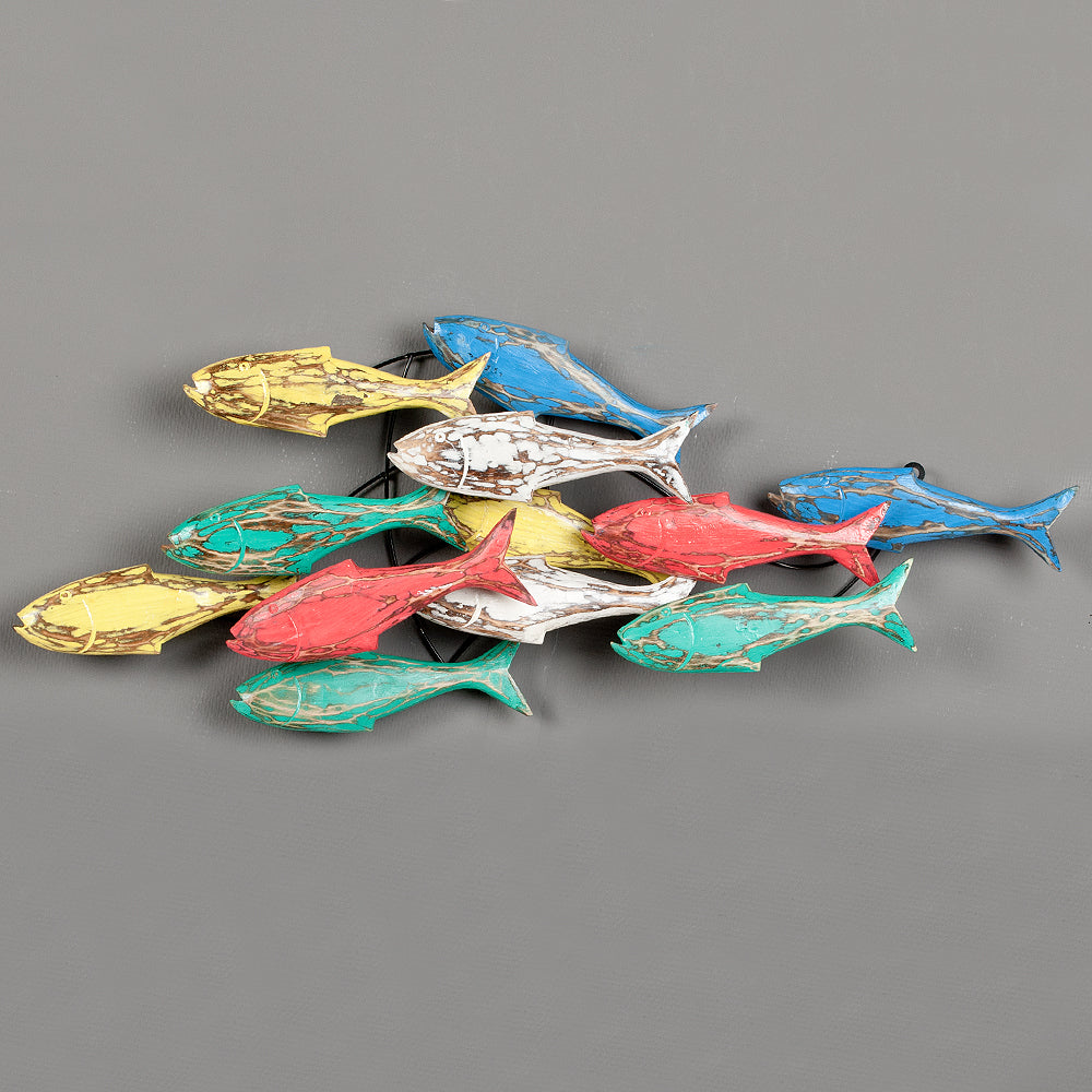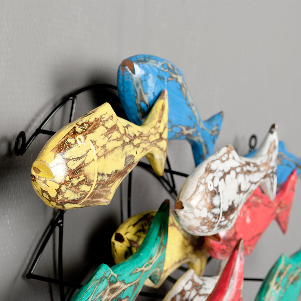 Wand-Deko IKAN aus Holz - Bunt. Außergewöhnliche Wanddekoration in Form eines Fischschwarmes. Die Fisch-Figuren bestehen aus Holz und sind auf einem Metallgestell befestigt, welches sich problemlos an der Wand befestigen lässt (Ösen).