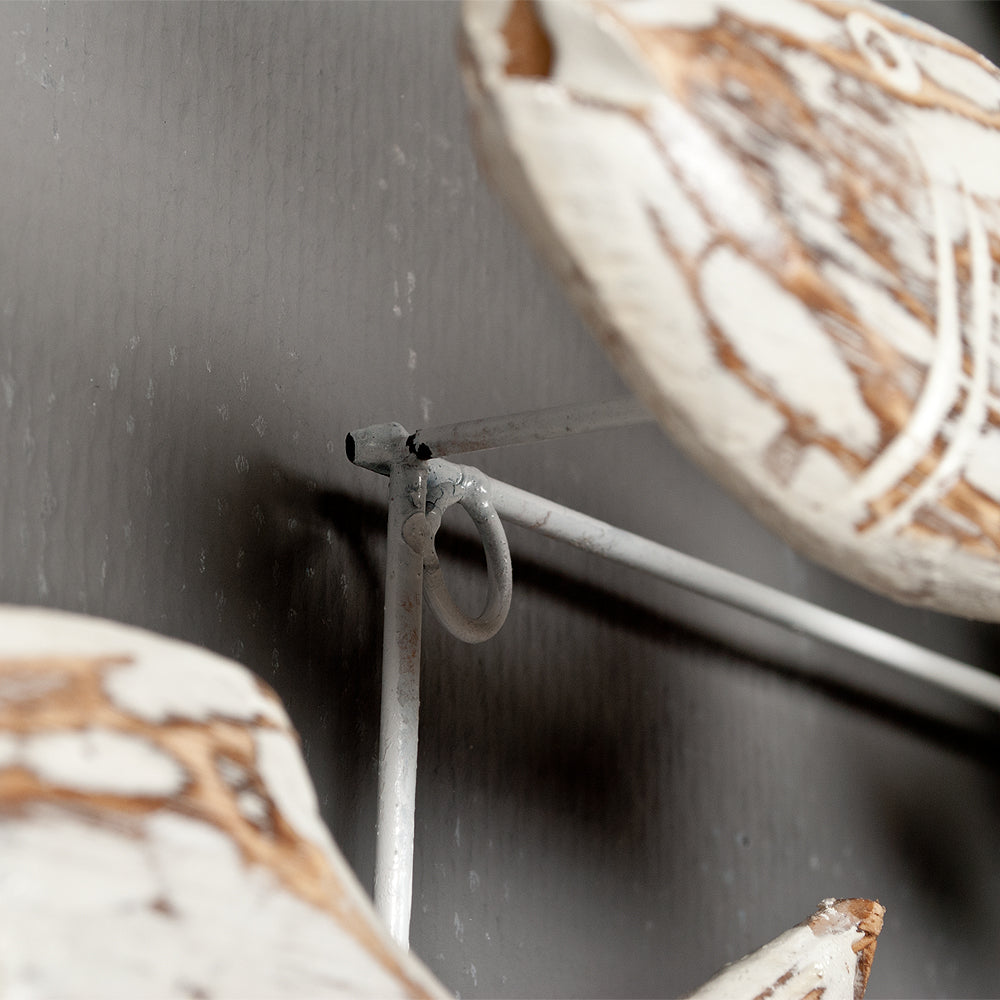 Wand-Deko IKAN aus Holz - White Wash. Außergewöhnliche Wanddekoration in Form eines Fischschwarmes. Die Fisch-Figuren bestehen aus Holz und sind auf einem Metallgestell befestigt, welches sich problemlos an der Wand befestigen lässt (Ösen).