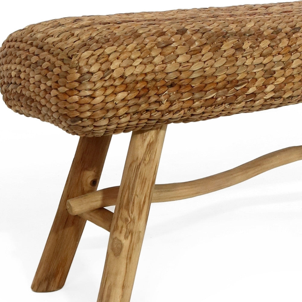 Natürlicher Look: Wasserhyazinth mit seinen verschiedenen Brauntöne und das Teakholz betonen den ursprünglichen Charme dieser Bank.