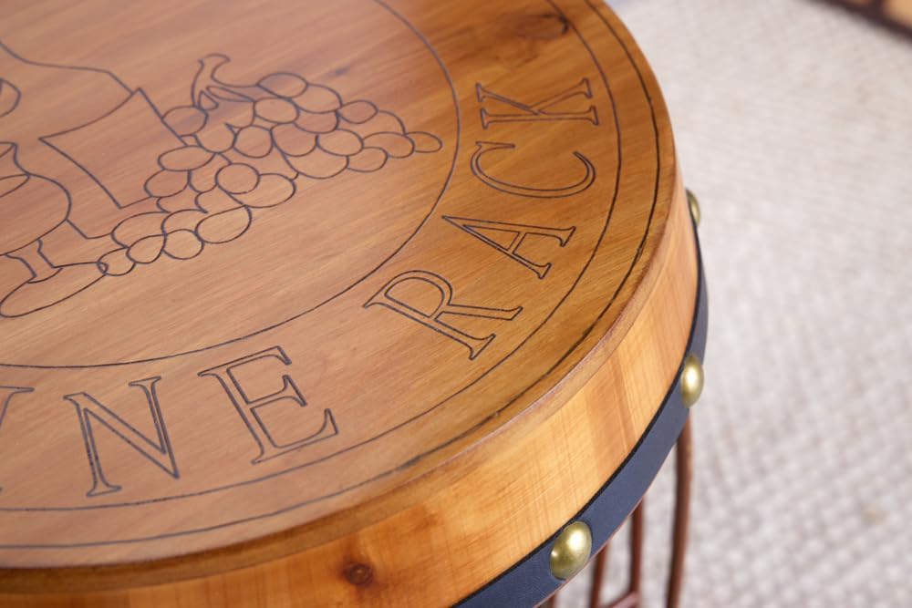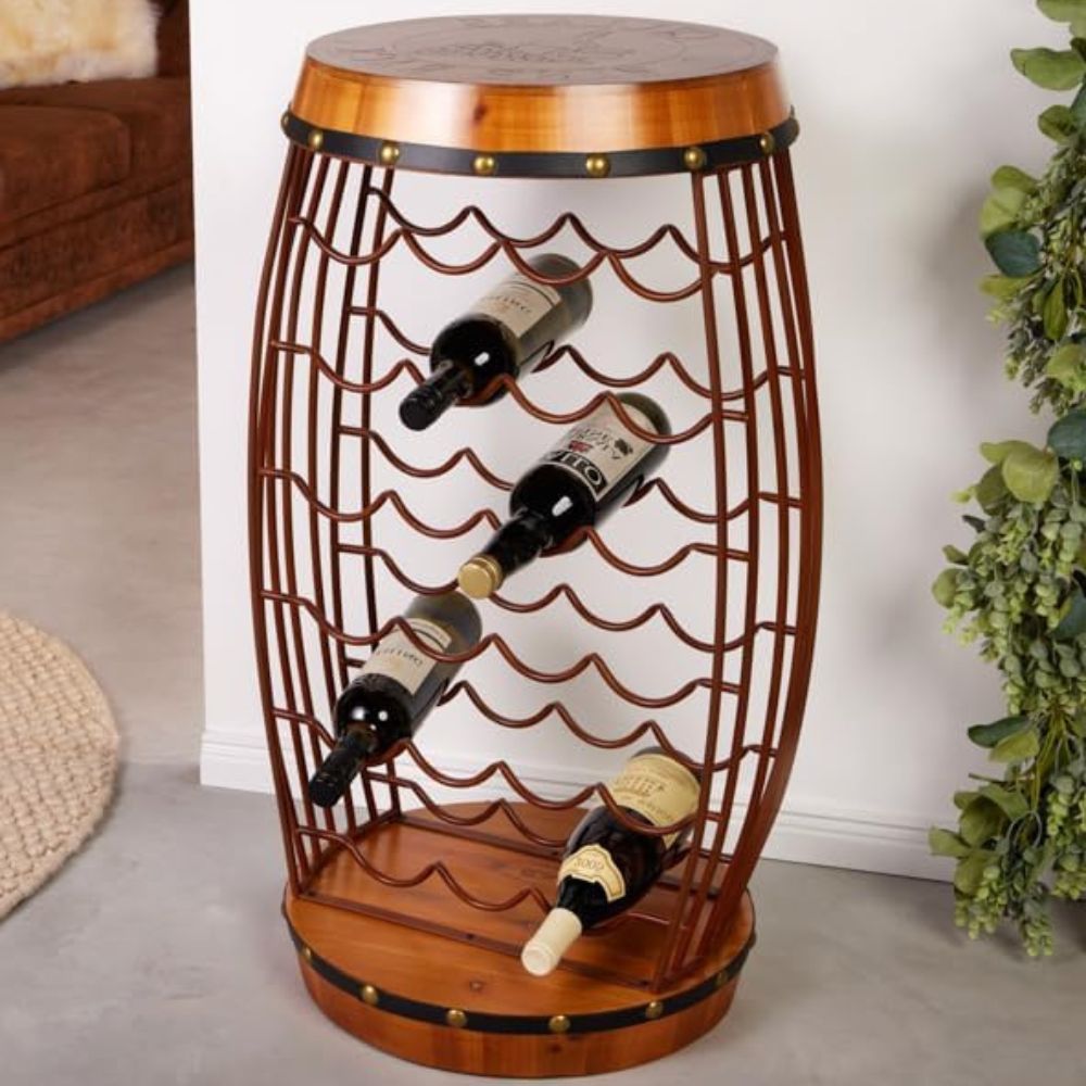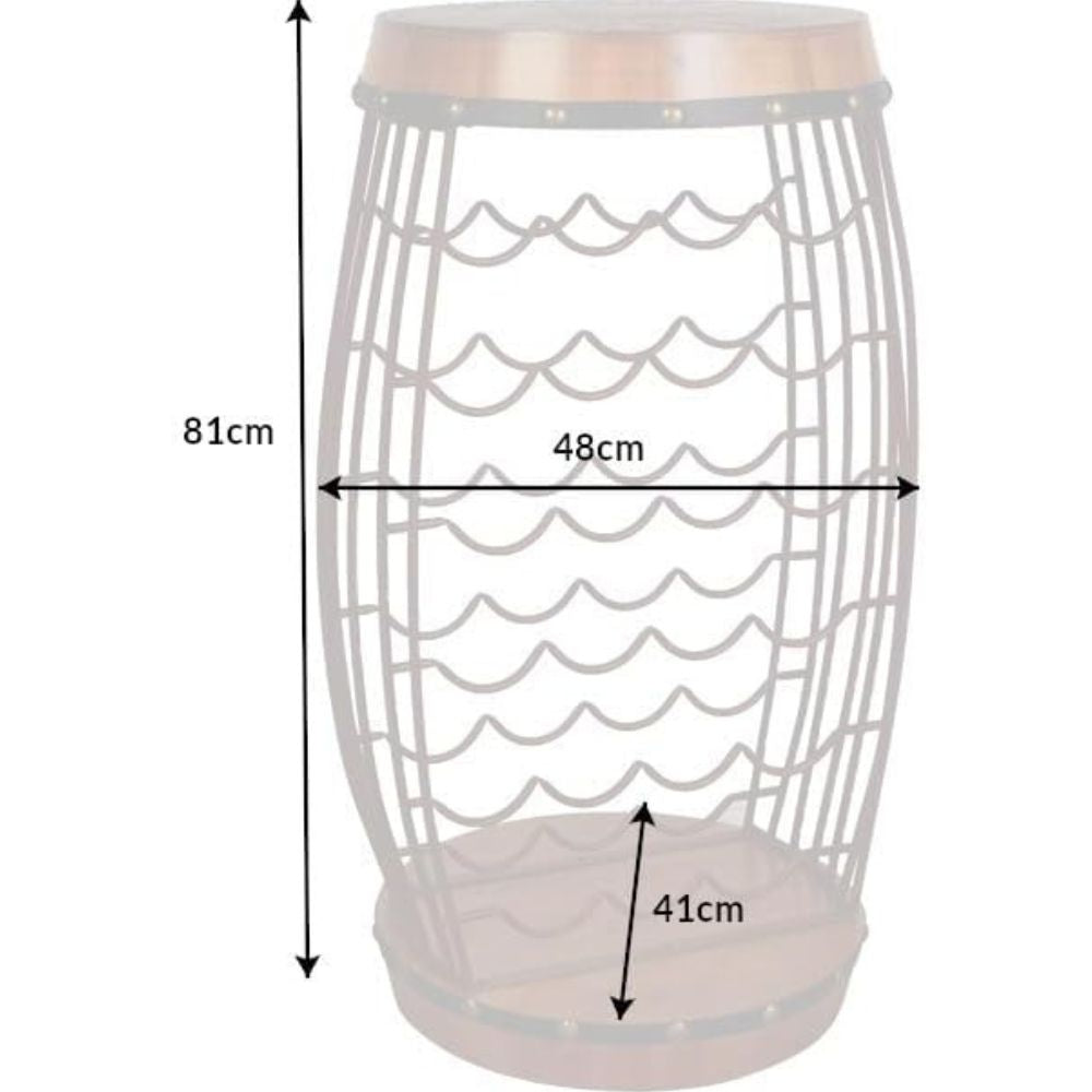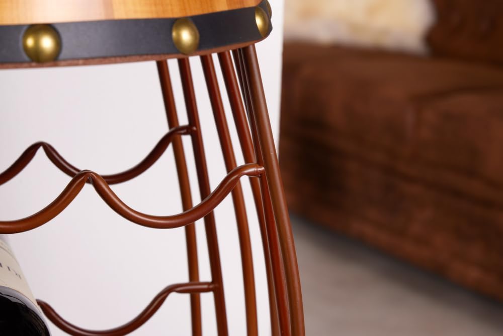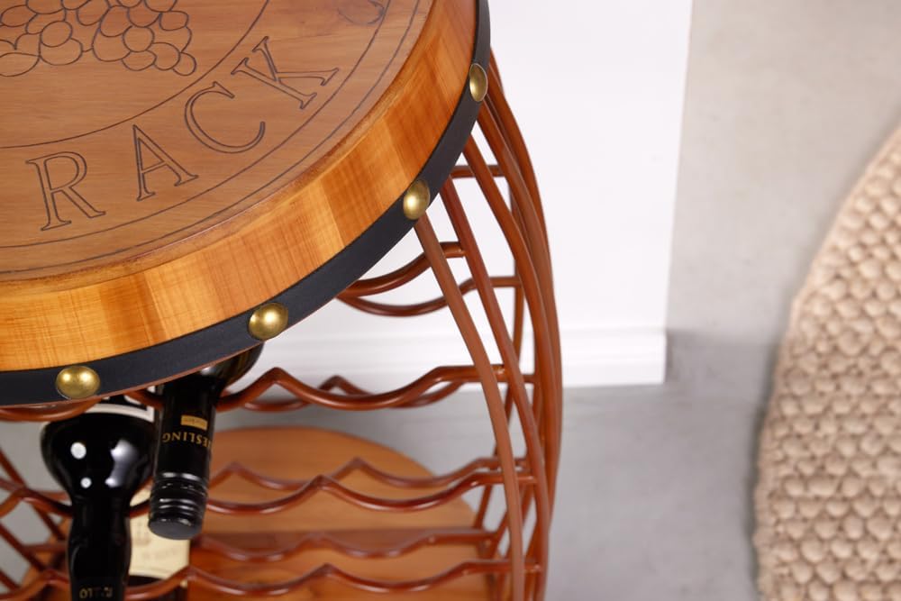 Das Weinregal besticht durch seine außergewöhnliche Kombination aus Pinienholz und einem robusten Metallgestell, welches an ein traditionelles Weinfass erinnert. Diese harmonische Verbindung aus Naturmaterialien und industriellem Design verleiht deinem Zuhause eine moderne und gleichzeitig gemütliche Atmosphäre.