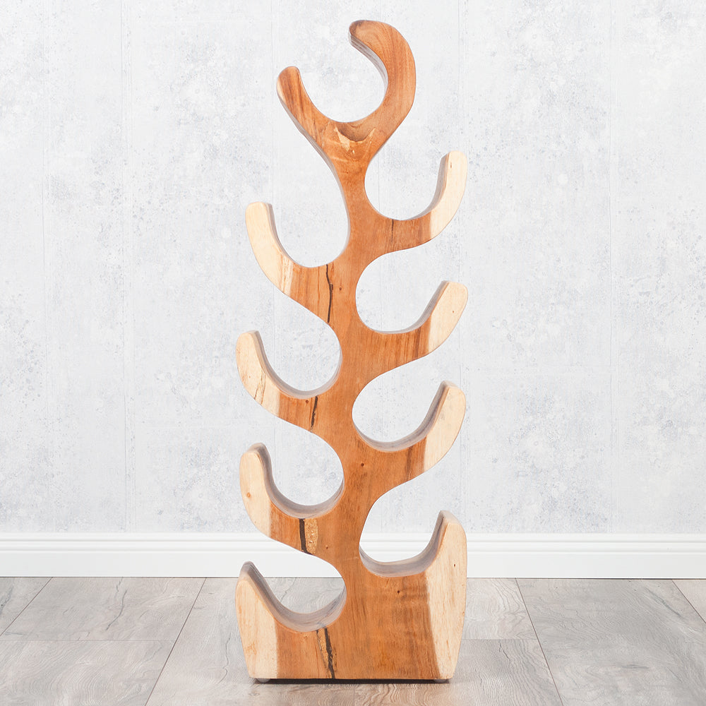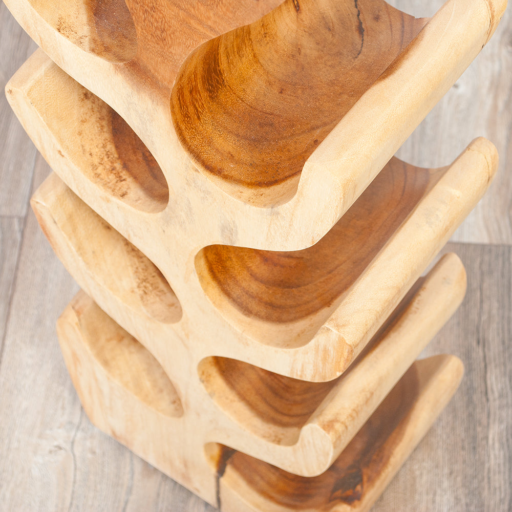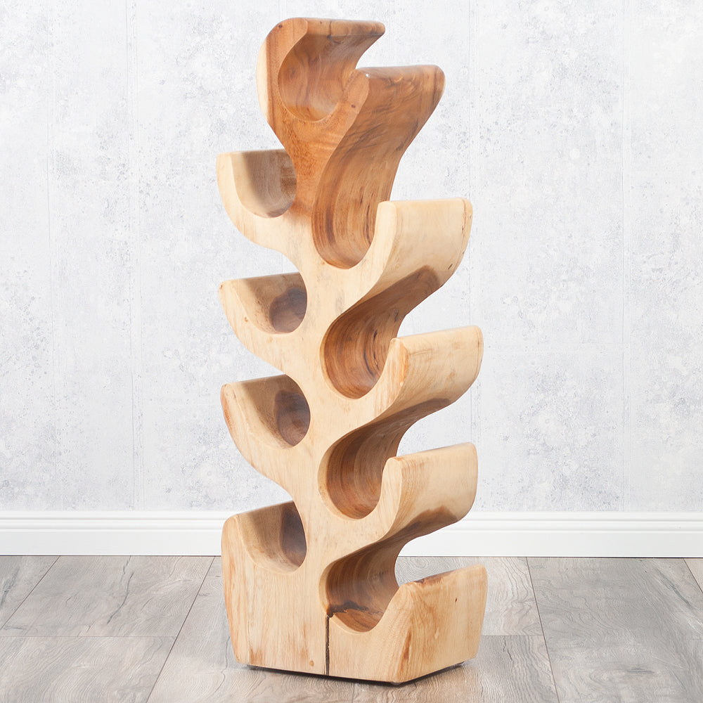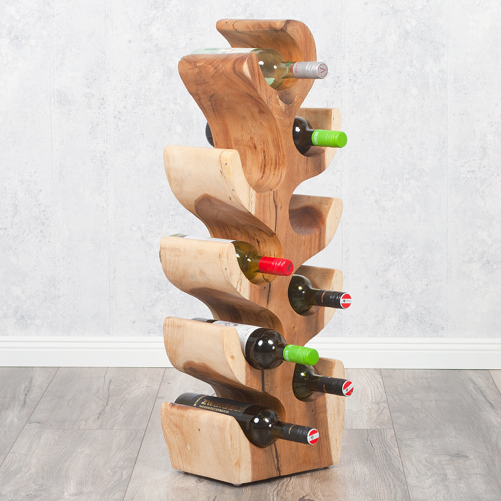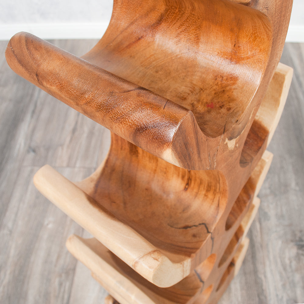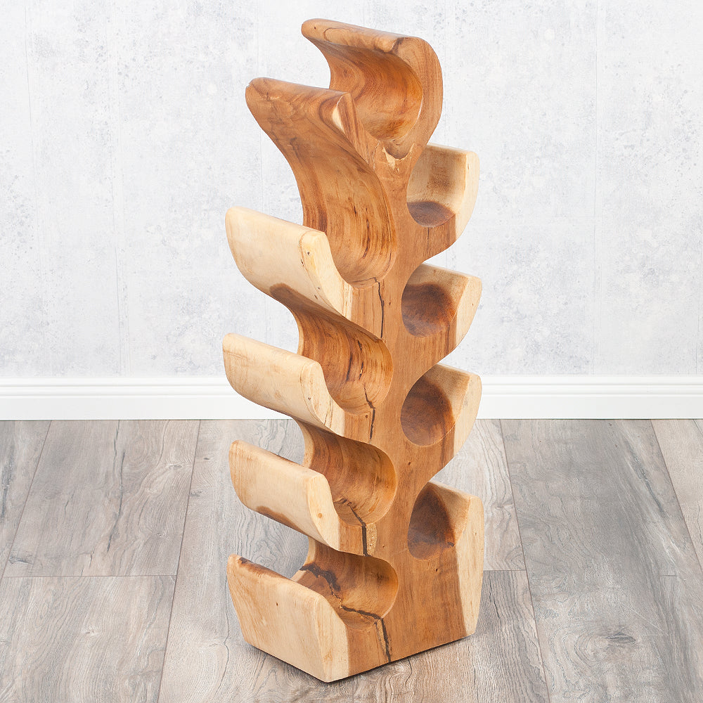 Dieses Weinregal ist ein in Bali handgefertigtes Unikat aus hochwertigem tropischem Suarholz und überzeugt mit einer ausgefallenen Optik. Die asymmetrische, blattähnliche Form bietet Platz für insgesamt 9 Flaschen Ihrer Wahl. In einer leeren Ecke im Wohnzimmer oder aber neben der Bartheke im Essbereich kommt das dekorative Regal besonders zur Geltung. Aus einem Stück gefertigt dient das Wohnaccessoire nicht nur als Weinhalterung, sondern eignet sich auch perfekt als außergewöhnliche Skulptur.