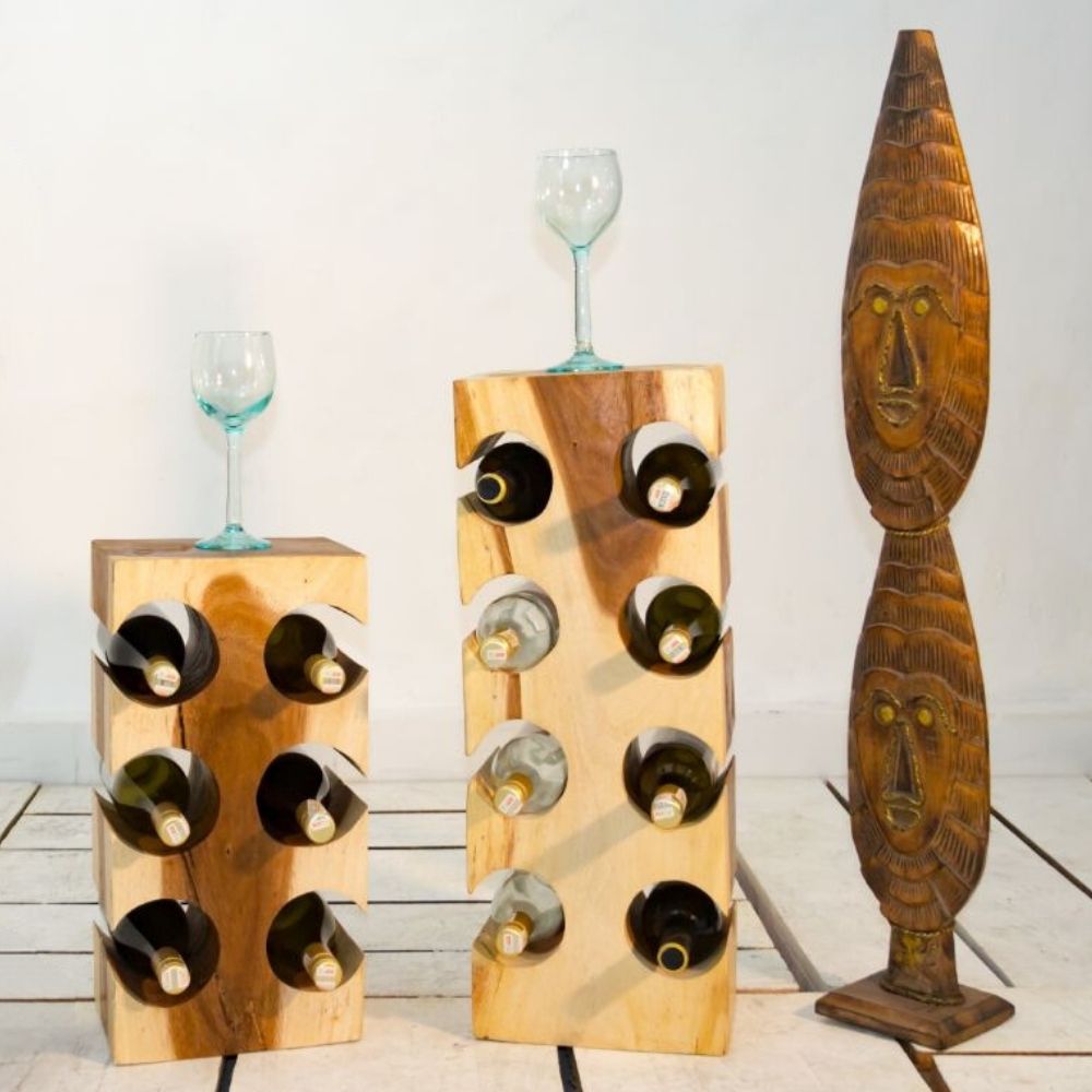 Dieses Weinregal ist ein in Bali handgefertigtes Unikat aus hochwertigem tropischem Suarholz und überzeugt mit einer ausgefallenen Optik. Die asymmetrische, blattähnliche Form bietet Platz für insgesamt 6 Flaschen Ihrer Wahl. In einer leeren Ecke im Wohnzimmer oder aber neben der Bartheke im Essbereich kommt das dekorative Regal besonders zur Geltung. Aus einem Stück gefertigt dient das Wohnaccessoire nicht nur als Weinhalterung, sondern eignet sich auch perfekt als außergewöhnliche Skulptur.