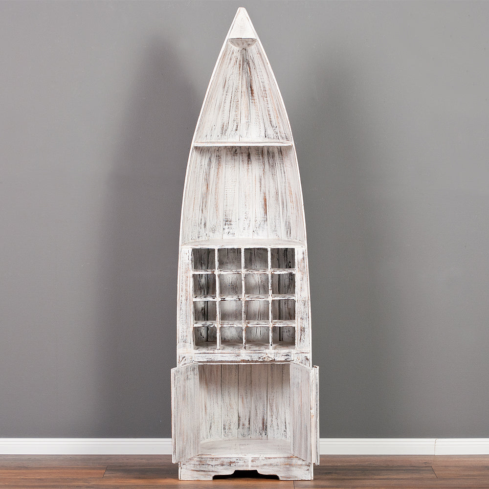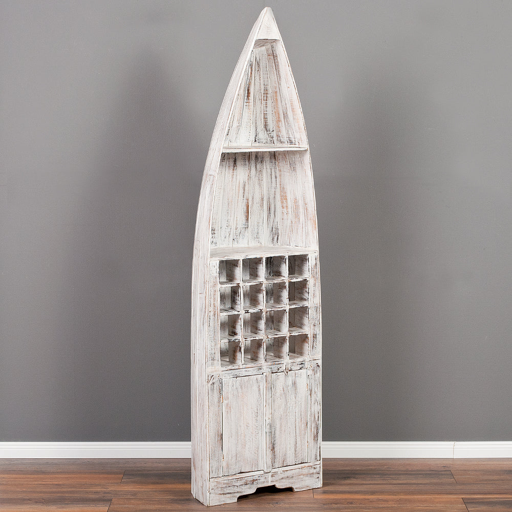 Bootsregal / Weinregal PINTU. Dieses aussergewöhnliche Regal in Form eines Bootsrumpfes wurde in Handarbeit aus Albasia-Holz gefertigt. Durch die immer individuelle Farbgebung und kleinen Unebenheiten wird jedes dieser Regale zu einem Unikat und hat somit seinen eigenen, besonderen, unvergleichlichen Charakter. Die beiden Ablagefächer und der Stauraum (hinter den Türen) bieten viele Möglichkeiten zum Dekorieren und Aufbewahren von z.B. Küchenutensilien, Büchern, Deko-Artikeln. Zudem finden bis zu 16 Flaschen (Weinflaschen/Fachmaß: ca. 9x9cm). in diesem Regal einen stilvollen Aufbewahrungsort. Natürlich müssen / können dies nicht nur Weinflaschen sein. Dieser extravagante Artikel bringt ihre besten Weine / Flaschen eindrucksvoll zur Geltung.