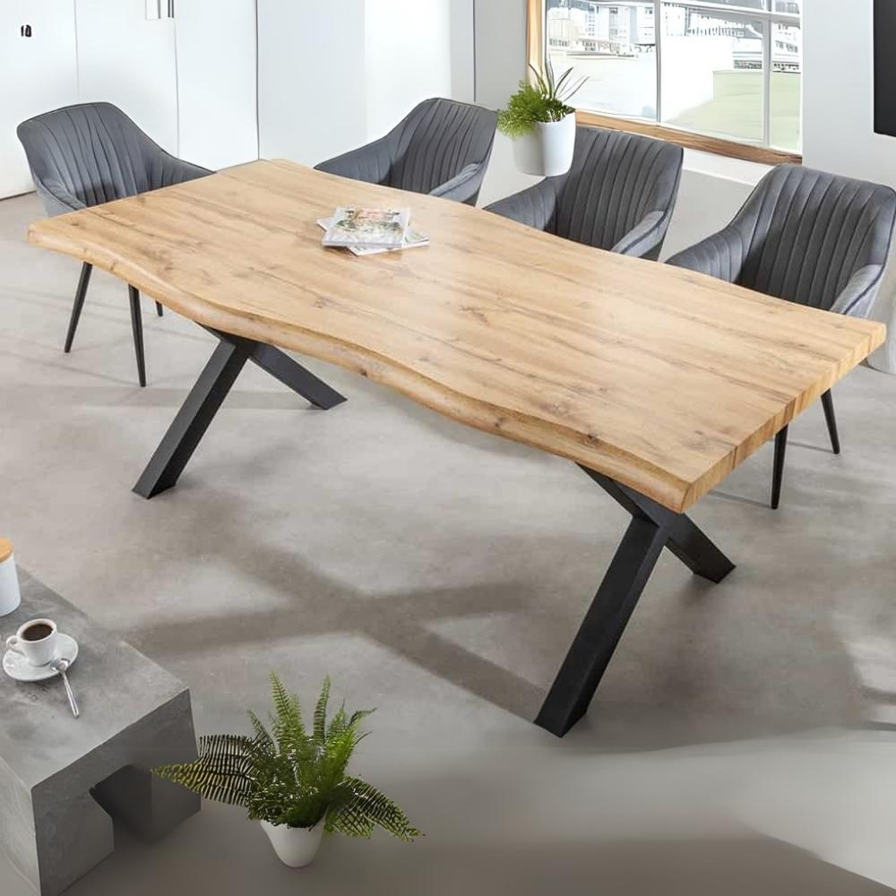 Das robuste X-Gestell aus schwarzem Metall sorgt nicht nur für Stabilität, sondern setzt auch einen markanten Kontrast zur natürlichen Holzoptik. Es verleiht dem Tisch seinen unverwechselbaren Loft-Charakter und macht ihn zum perfekten Begleiter für moderne Wohnkonzepte im Industrial- oder Scandi-Stil.